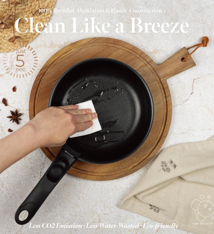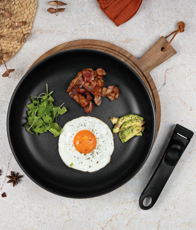 Ergonomické rukojeti Click It s měkkým povrchem zůstávají chladné i při vysokých teplotách, což zajišťuje pohodlnou a bezpečnou manipulaci bez rizika popálení. Minimalistický matný povrch v kombinaci černé a růžovo-zlaté barvy dodává sadě moderní a stylový vzhled, který se hodí do každé kuchyně.