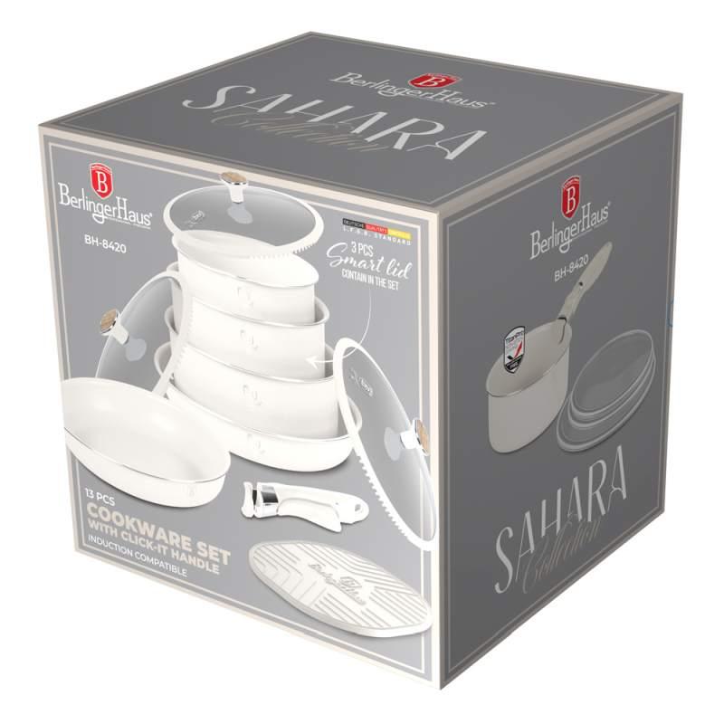 Berlingerhaus Sahara Nordic Collection nabízí spojení funkčnosti a moderního designu, které ocení každý kuchař. Tato sada nádobí je vybavena 3vrstvým nepřilnavým povrchem TitanPro, který usnadňuje vaření i čištění. Díky stohovatelnému provedení šetří místo ve vaší kuchyni a chytrá víka Click It umožňují bezpečnou a pohodlnou manipulaci během přípravy pokrmů.