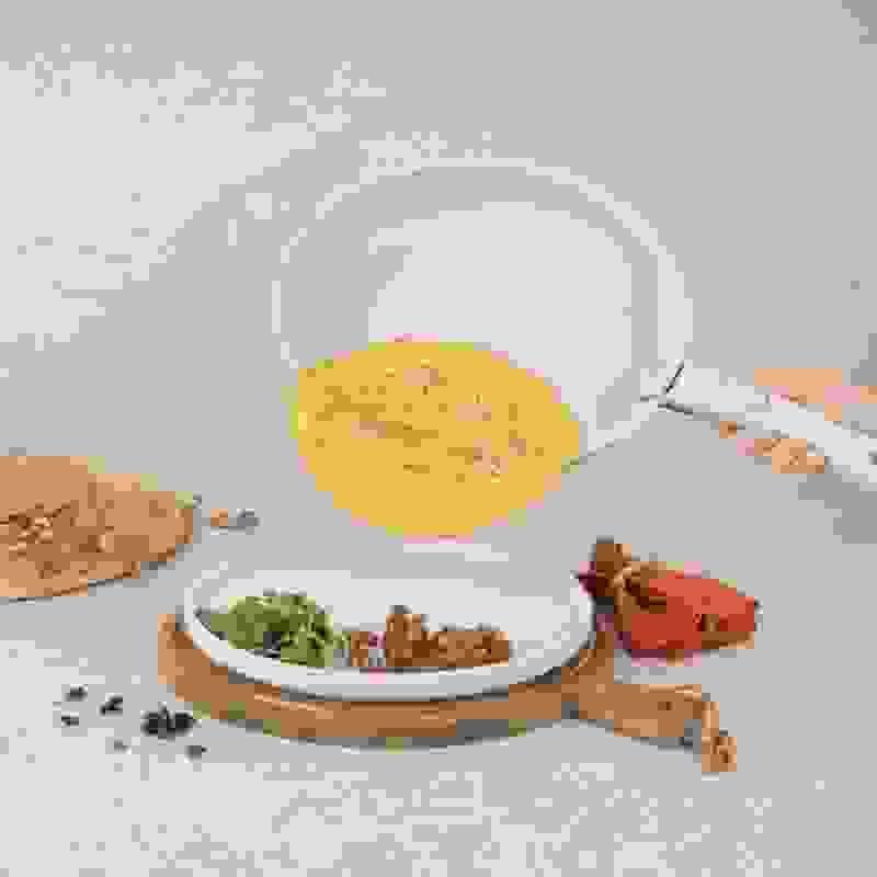 Ergonomické knoflíky s měkkým dotykem a světlou dřevěnou barvou zůstávají chladné i při vysokých teplotách, což zvyšuje komfort a bezpečnost při vaření. Matný povrch v kombinaci krémové a dřevěné barvy dodává sadě stylový a moderní vzhled, který se hodí do každé kuchyně.