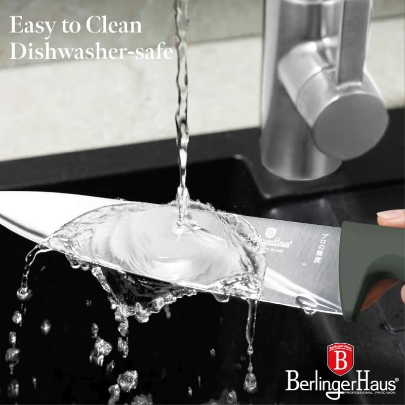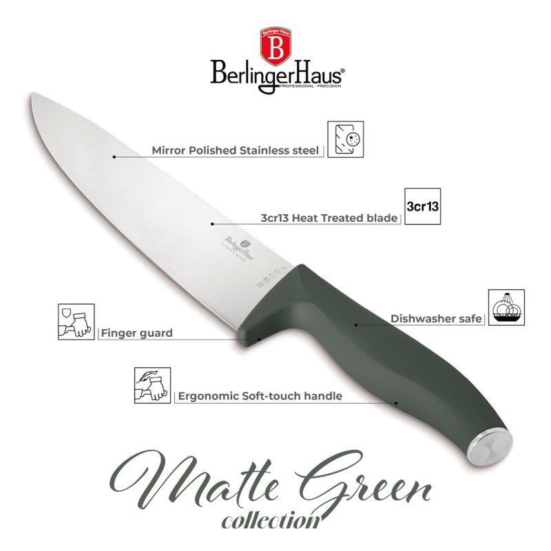 Sada šesti nožů z kvalitní nerezové oceli s ergonomickými rukojetmi a bezpečnostním chráničem prstů v elegantní matně zelené barvě.Sada kuchyňských nožů Berlingerhaus představuje spojení precizního zpracování, funkčnosti a moderního designu, který ocení každý, kdo rád tráví čas vařením. Nože jsou vyrobeny z vysoce kvalitní nerezové oceli, která zajišťuje dlouhou životnost a udržení ostrosti čepelí i při častém používání.