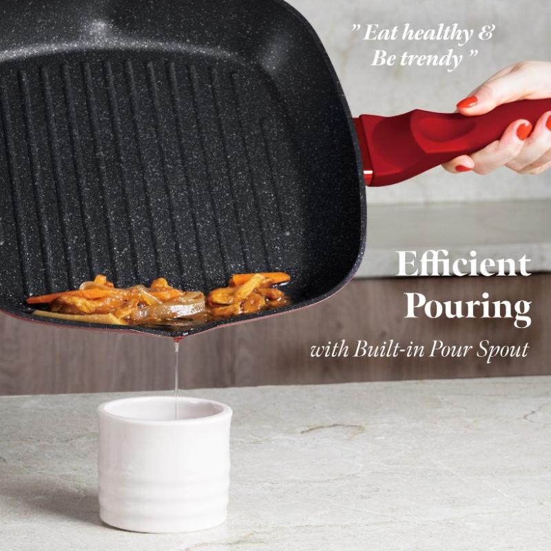 Tato sada obsahuje tři pánve různých velikostí, které jsou vyrobené z kovaného hliníku s odolným třístupňovým nepřilnavým povrchem s mramorovým designem. Díky tomu se jídlo nepřichytává a čištění je jednoduché, což ocení každý, kdo hledá pohodlné vaření.