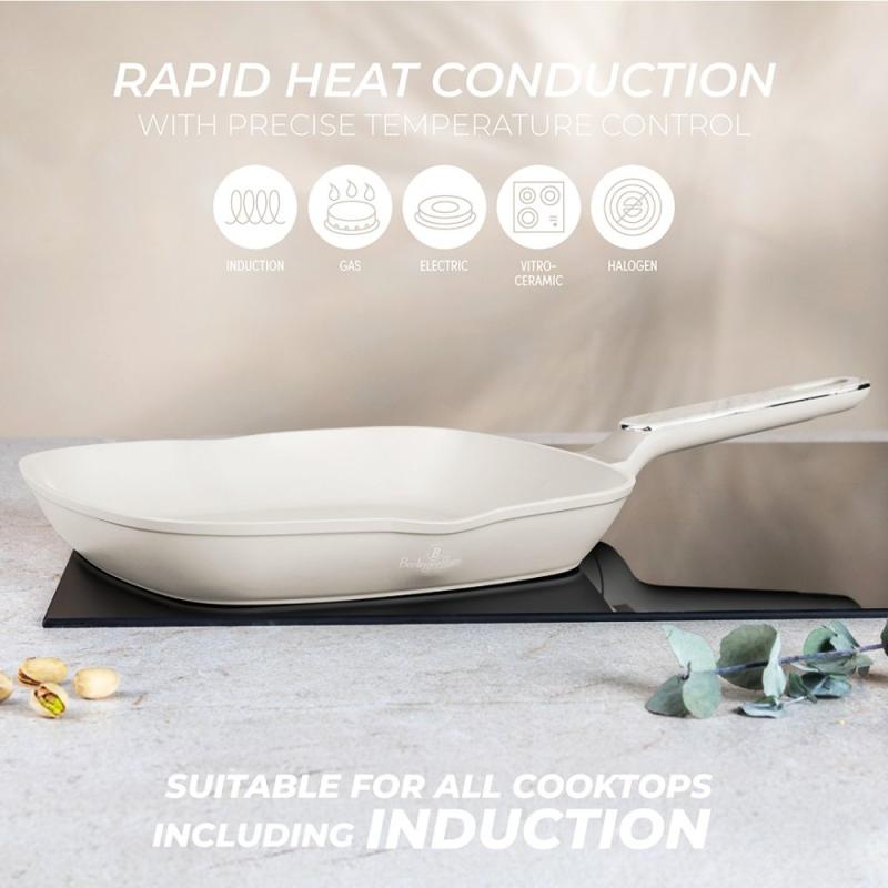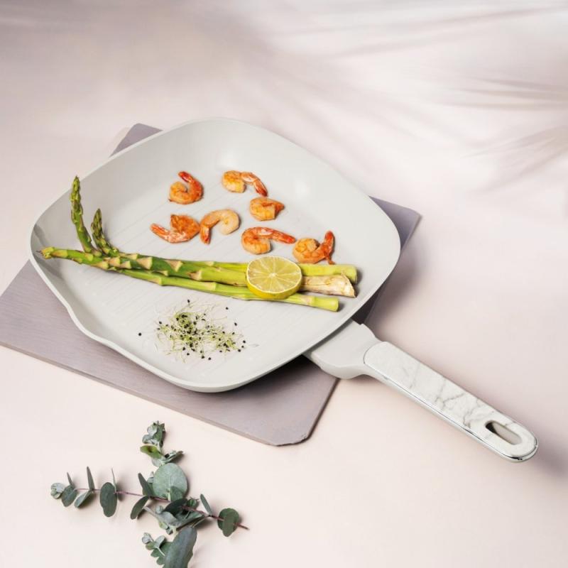 Ergonomické rukojeti jsou potažené měkkým povrchem s elegantní stříbrnou vložkou a ladí s mramorovým designem, přičemž zůstávají příjemně chladné i při vaření. Díky výkonnému indukčnímu turbo systému se pánve rychle zahřívají a šetří energii, přičemž jsou kompatibilní se všemi typy varných desek včetně indukčních, sklokeramických, plynových a elektrických.