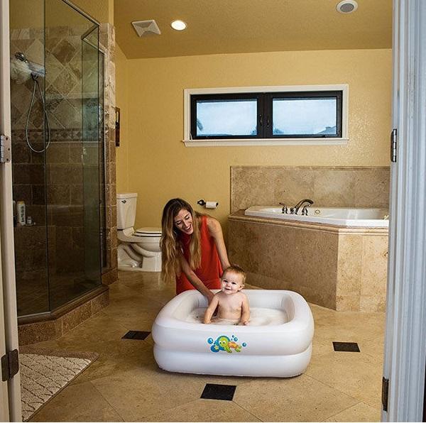 Nafukovací bazénik/vanička pre deti sa skladá z dvoch samostatne nafukovacích častí. Každá časť má bezpečnostný ventil, ktorý zabraňuje úniku vzduchu. Nafukovacia spodná časť bazéniku (dno) bráni nekontrolovanému šmýkaniu dieťaťa a zároveň je veľmi pohodlná.