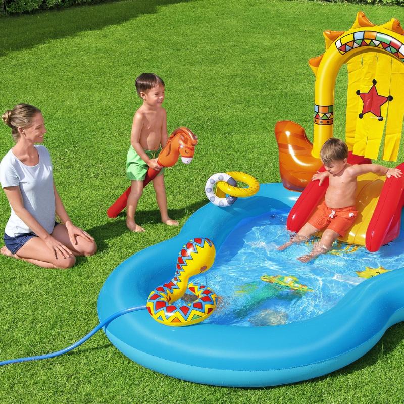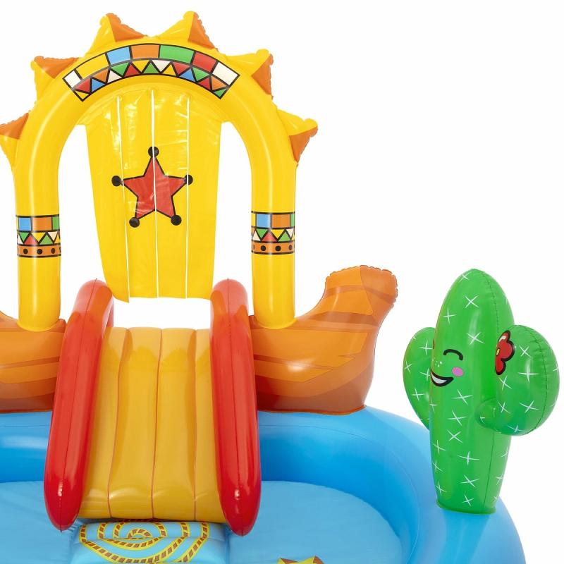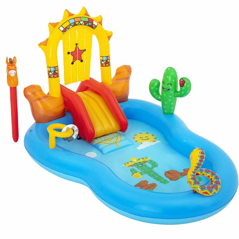 Máte doma malé děti, které baví western? Také by si vaše ratolesti přáli být kovbojové?Dejte jim tu možnost, úžasný nafukovací bazének Bestway vám dobře psolouží jako bazének na vodu vhodný naz ahradu nebo naopak jako suché hrací centrum třeba do pokoje.