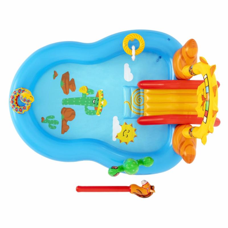 • Bazének pro děti má odnímatelnou nafukovací skluzavku s šerifovou hvězdou. Objem bazénku je 278 l a rozměry jsou 264 x 188 x 140 cm.