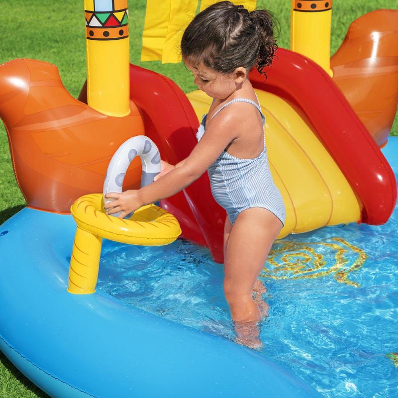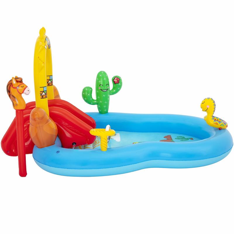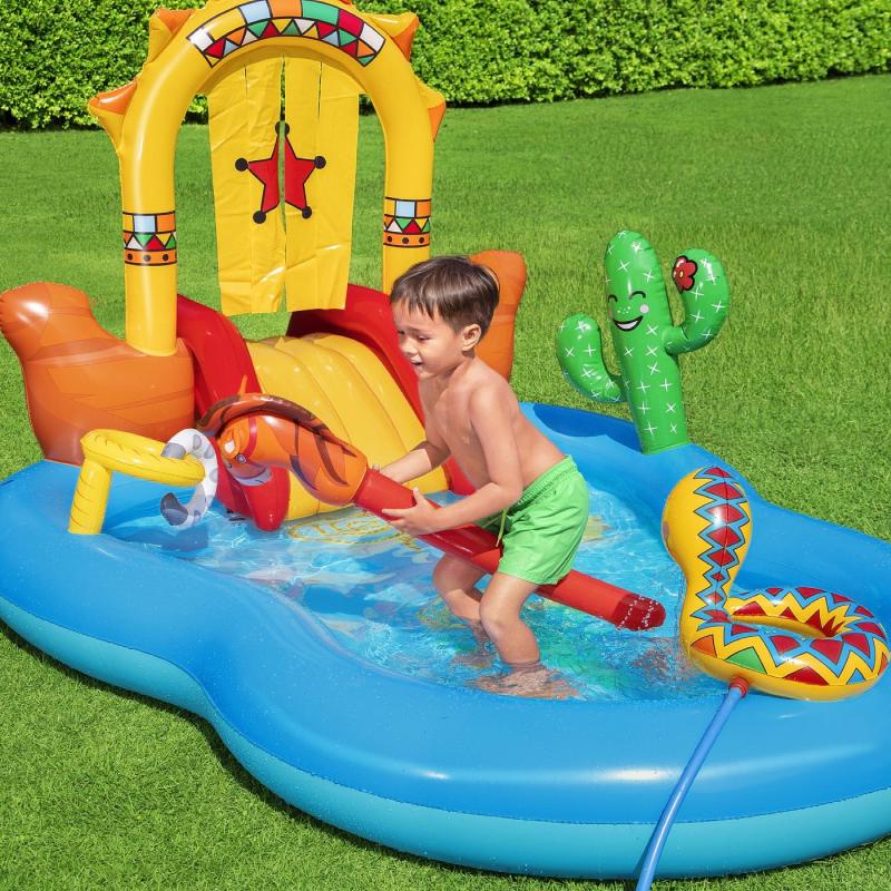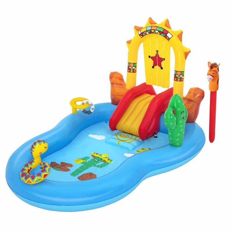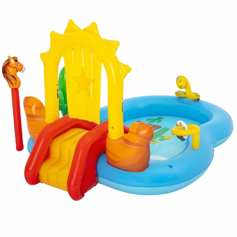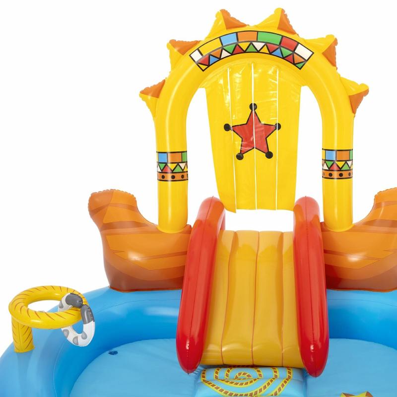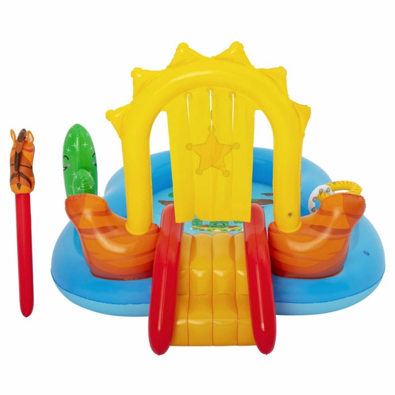 Máte doma malé děti, které baví western? Také by si vaše ratolesti přáli být kovbojové?Dejte jim tu možnost, úžasný nafukovací bazének Bestway vám dobře psolouží jako bazének na vodu vhodný naz ahradu nebo naopak jako suché hrací centrum třeba do pokoje.• Bazének pro děti má odnímatelnou nafukovací skluzavku s šerifovou hvězdou. Objem bazénku je 278 l a rozměry jsou 264 x 188 x 140 cm.