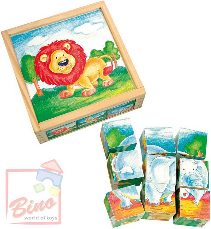 Bino DŘEVO Kostky (kubus) divoká zvířata 9 ks (dřevěná hračka)