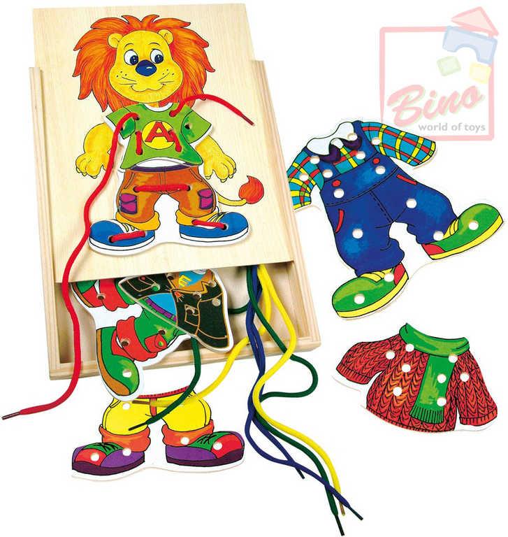 Bino DŘEVO Lvíček Leo první šití (dřevěná hračka)