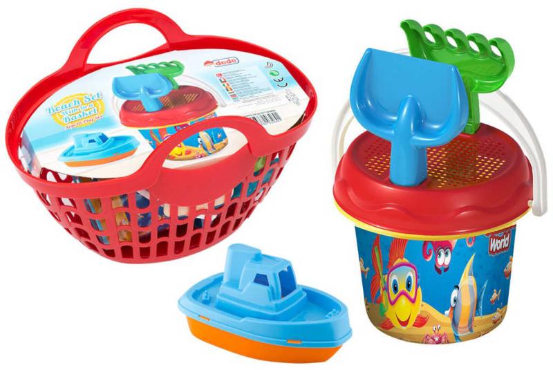 Tato sada hraček na písek a k vodě je vyrobena z kvalitního a pevného materiálu. V košíku se nachází kyblík se sítkem, lopatka, hrábě a loďka na vodu (parník). Hraní na pískovišti a stavění báboviček zajistí dětem mnoho hodin zábavy. Tyto hračky dokonale podporují