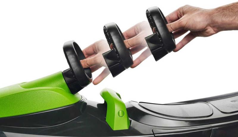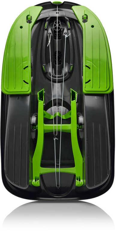 automatický navíjecí mechanismus tažného lana, masivní brzdu s pružinou k navrácení do původní polohy a dvě sedátka. To vše na jednoduchý click-on mechanismus a tedy žádné kovové prvky,
