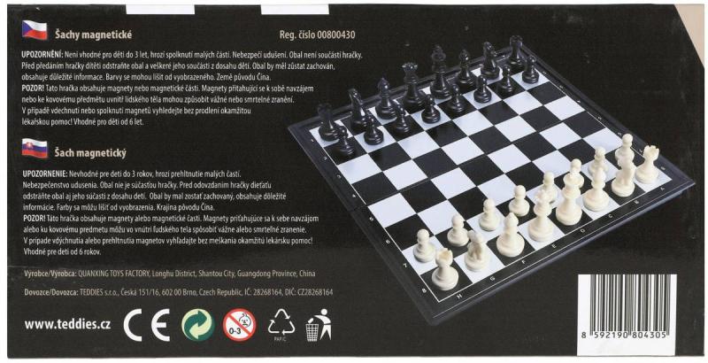 Klasická hra šachy v praktickém magnetickém provedení pro ještě větší komfort a přehlednost! Díky magnetickým figurkám zůstává hra stabilní i během cestování. Ideální pro děti i dospělé, začátečníky i pokročilé hráče. Elegantní černobílý design a pevné balení dělají z této sady skvělý dárek i výbavu na cesty.