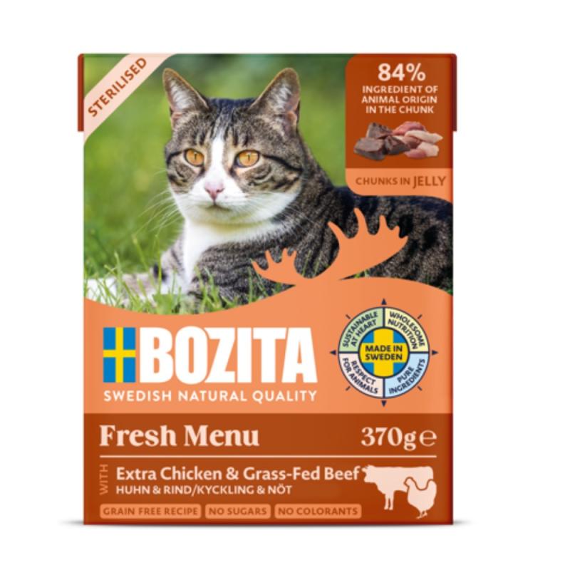 Bozita Cat Sterilised chutné kompletní mokré krmivo přizpůsobené pro sterilizované kočky. Připravené z vysoce kvalitních surovin a 84 % složek živočišného původu v kouscích.