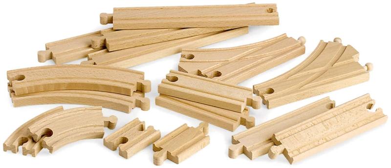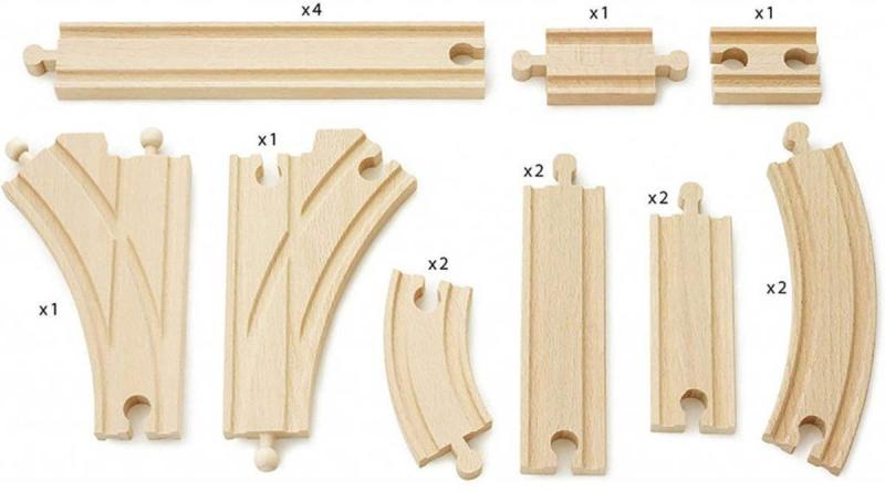 Set obsahuje 16 dílů různých kolejí k vláčkodráhám: 4 dlouhé rovné, 2 středně dlouhé rovné, 2 krátké rovné, 2 výhybky, 2 krátké zatáčky, 2 dlouhé zatáčky a 2 speciální spojovací koleje se stejnými spojovacími prvky (čudlík - čudlík, dírka - dírka). Koleje jsou vyrobeny z kvalitního bukového dřeva.
