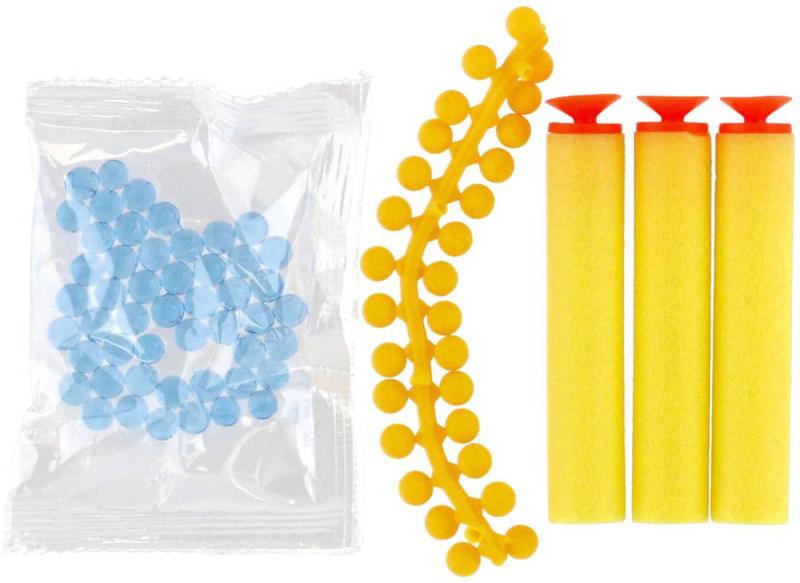 Obsah balení: dětská zbraň, papírový terč, sáček s modrými vodními kuličkami, gumové náboje 28ks (1 hrozen), pěnové náboje 3ks