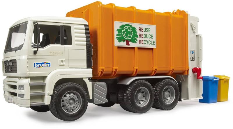 BRUDER 02772 Auto popelářské MAN TGA popeláři bílo-oranžové. Detailní model, kvalitní a odolný plast, funkční části, vyrobeno v Německu. Součástí 2 popelnice.Snad každý malý kluk chtěl být někdy popelářem. Umožněte to vašemu dítěti s tímto stylovým popelářským autem. Auto má spoustu prvků a měkké profilované pneumatiky. Auto dokáže vyklápět jak popelnice tak i kontejnery. Celou korbu pak lze vyklopit a vysypat odpadky. Sada obsahuje 2 popelnice. K modelu se výborně hodí ještě sada popelnic.