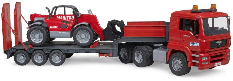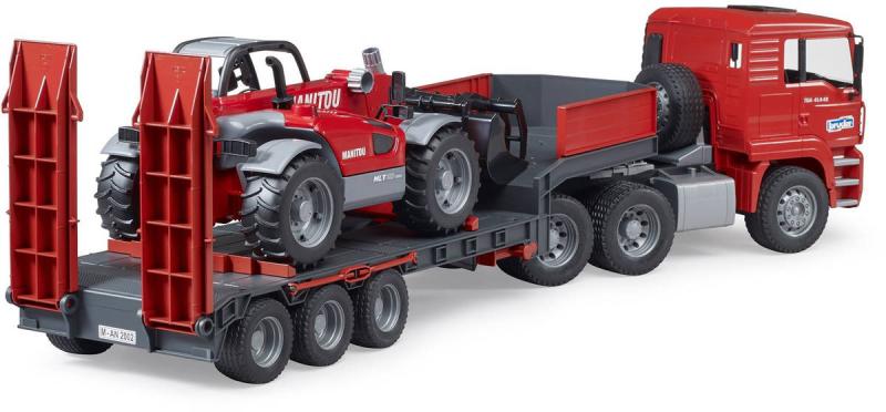 Nákladní auta s přívěsem se často používají k přepravě velkých či težkých věcí jako jsou třeba stavební stroje. Tento nákladní vůz MAN TGA přepravuje teleskopický manipulátor Manitou MT633. Model má plně funkční návěs, sklopné podpěry a pohyblivé nájezdové rampy. Spolu s ním dodávaný teleskopický manipulátor Manitou má výsuvné a výškově nastavitelné teleskopické rameno a také odnímatelnou lopatu.