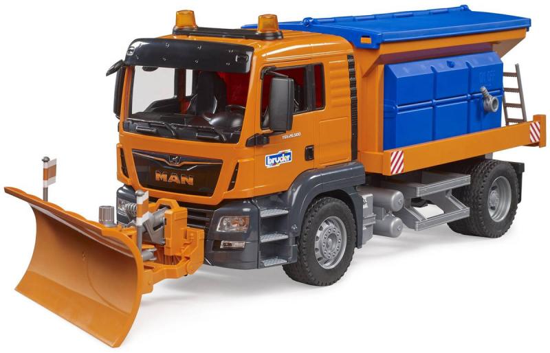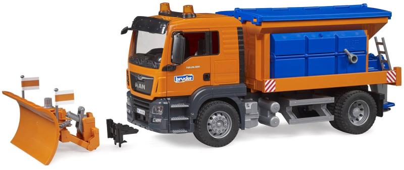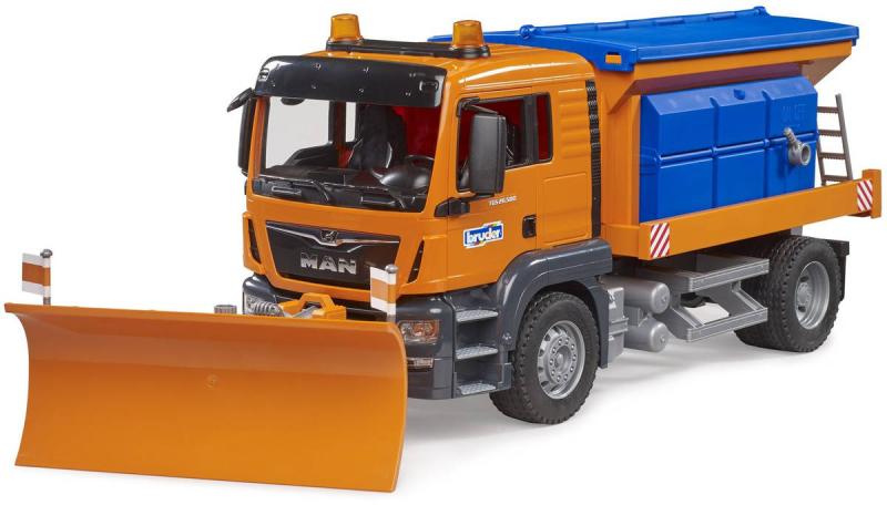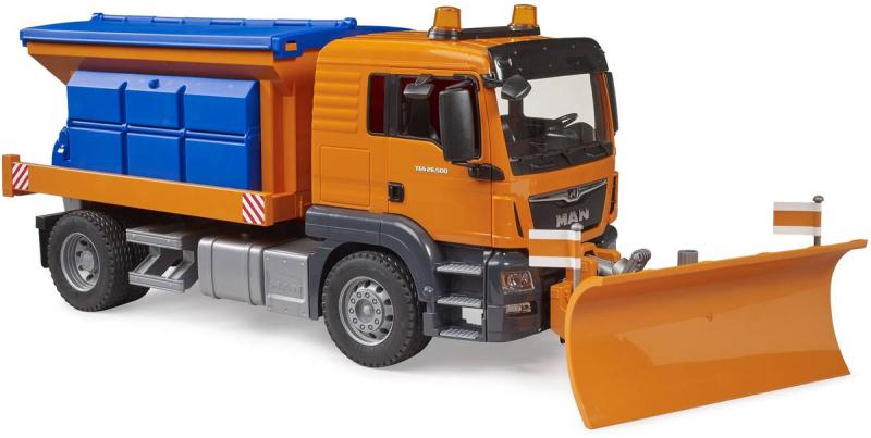 Detailně zpracovaný model silničářského vozu MAN TGS značky Bruder si zamiluje každý chlapec. Nabízí spoustu reálných funkcí, které slibují perfektní zábavu. Disponuje funkčním sypacím mechanismem se šnekovým dopravníkem, jež se ovládá pomocí páky. V zimně malý silničář ocení sněžnou radlici, která se rovněž ovládá pomocí páky a jejíž úhel lze nastavit v rozmezí +/- 30°. V neposlední řadě potěší otevírací zásobník na posyp, sklopná zrcátka a otevírací dveře kabiny.