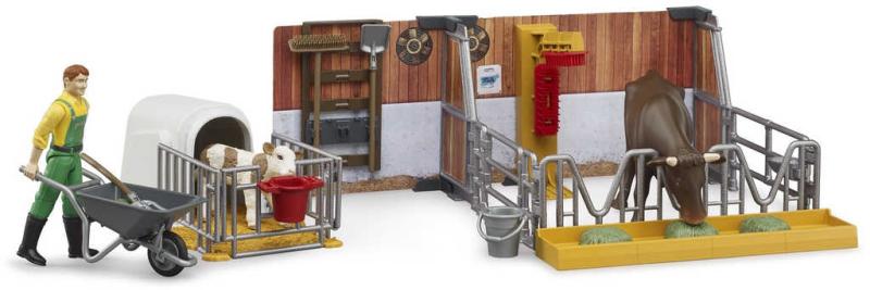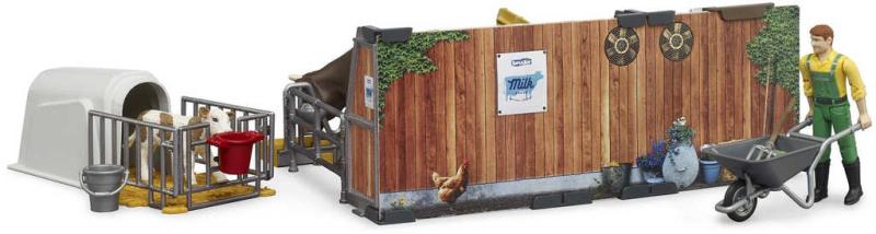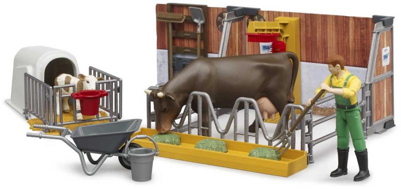 Obsah setu: figurka farmáře s pohyblivými končetinami, kráva s telátkem, stáj, box, krmný žlab a ohrady, kolečko, kbelíky, masážní kartáče, vidle a další vybavení