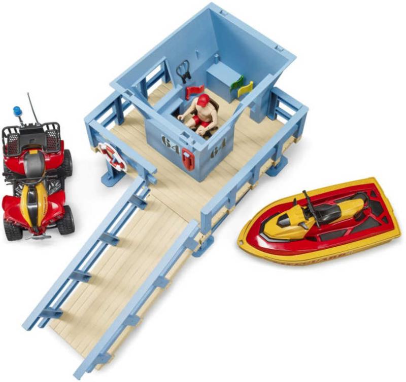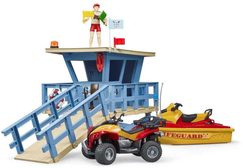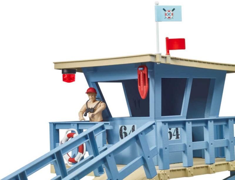 BRUDER 62780 - Věž pobřežní hlídky se čtyřkolkou, skútrem a plavčíkem.Relaxace a sport na vodě a ve vodě jsou velmi důležité volnočasové aktivity. O bezpečnost všech milovníků vodních sportů se stará plavčík a jeho stanice. Jeho úkolem je rozpoznat nebezpečí a rychle