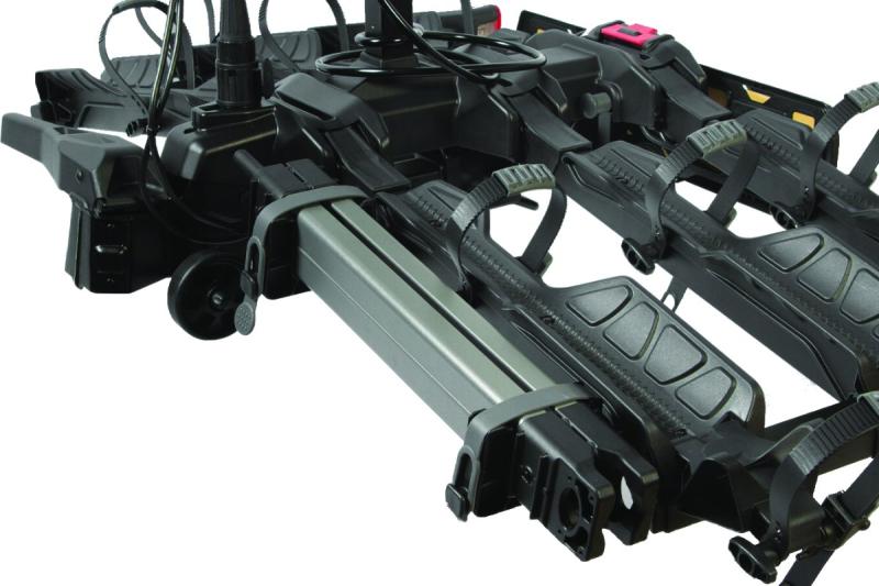 Univerzálny nosič na ťažné zariadenie, ktorý umožňuje bezpečnú prepravu až troch bicyklov, vrátane elektrobicyklov a ťažších modelov (max. 30 kg na bicykel, celková nosnosť 60 kg). Vďaka sklápacej funkcii ponúka ľahký prístup do kufra, aj keď sú bicykle upevnené. Integrovaná nakladacia rampa uľahčuje manipuláciu, zatiaľ čo stabilizačný systém a kvalitné uzamykacie mechanizmy zabezpečujú bezpečnosť počas jazdy.