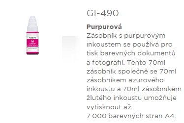 • Zásobník s purpurovým inkoustem se používá pro tisk barevných dokumentů a fotografií. Tento 70ml zásobník společně se 70ml zásobníkem azurového inkoustu a 70ml zásobníkem žlutého inkoustu umožňuje vytisknout až 7 000 barevných stran A4.