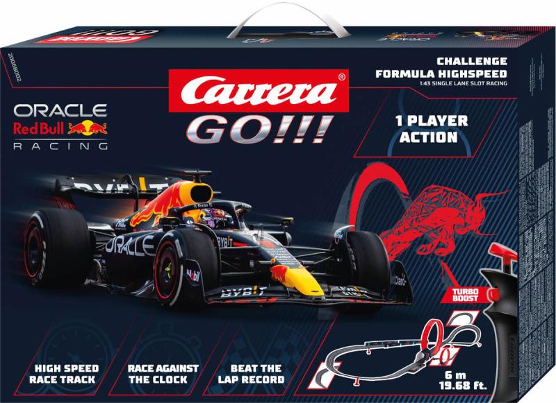 Autodráha Carrera GO!!! dlouhá 6m s autem Formula 1 Red Bull, na adptér, obsahuje looping, klopenou zatáčku, kolmou stěnu, rovinky, zatáčky, díl s počítadlem kol a další díly.Můžete si sestavit další různé trati podle své fantazie. Jedna dráha, jedno auto, jeden ovladač.