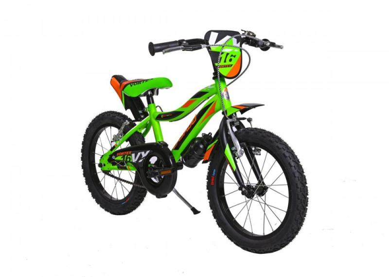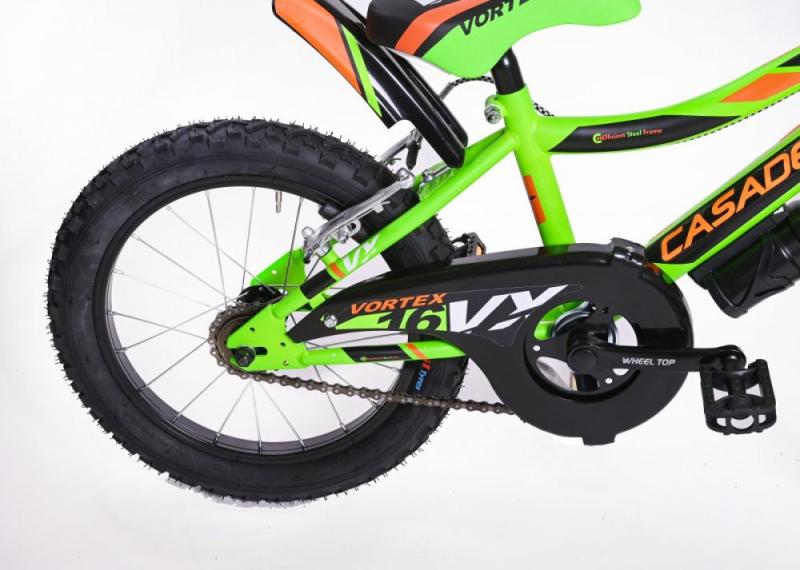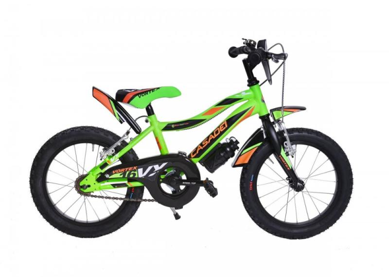 Dětské kolo Casadei Vortex 16 je nádherné chlapecké kolo typu BMX, které vykouzlí úsměv na tváři každého malého závodníka. Kolo má 16palcová nafukovací kola s kovovými ráfky a díky kvalitním plášťům s 3D vzorkem můžete vzít vaše kolo i do terénu. Kolo je určeno pro děti s výškou výškou postavy od 105 cm.Kolo má kvalitní ocelový rám typu BMX a nádherný matný lak, který okamžitě získá pozornost všech kolemjdoucích. Na řídítkách najdete ergonomické protiskluzové rukojeti, zvonek a dvě ruční páčkové brzdy, jejichž velikost je přizpůsobena pro malé dětské ruce. Pohodlné polstrované sedlo je výškově nastavitelné. Díky částečně uzavřenému krytu řetězu si děti nezašpiní kalhoty a nehrozí zachycení oděvu do ozubeného kola. Součástí balení je držák s láhví na pití, které ocení každý malý cyklista. Děti potěší také praktický stojan, díky kterému nemusí kolo pokládat na zem. Kolo obdržíte v přepravním kartonu, kdy kolo je již z výroby z 95 % předem smontováno. Po vybalení z kartonu stačí provést tyto jednoduché kroky, které vám nezaberou více než 30 minut: narovnání řídítek, montáž pedálů a doplňků ke kolu.