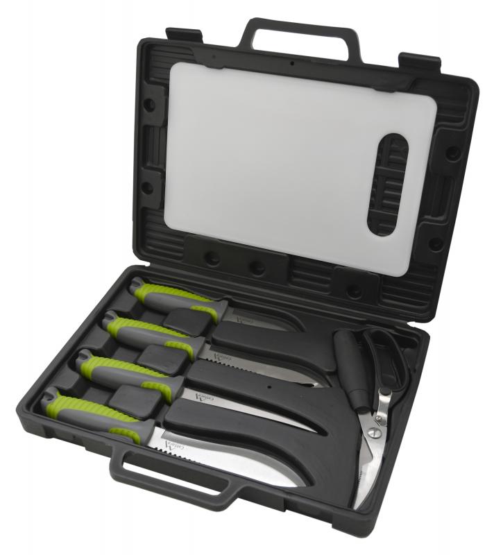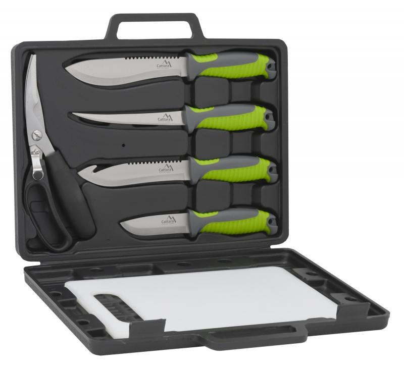 Grilovací sada skládající se ze 4 ks nožů, nůžek na drůbež a ryby a prkénka pro pohodlné porcování.Malý, střední, velký a filetovací Nůž je vyroben z kvalitní nerezové oceli s plastovou, ergonomicky tvarovanou rukojetí s pogumovaným povrchem.