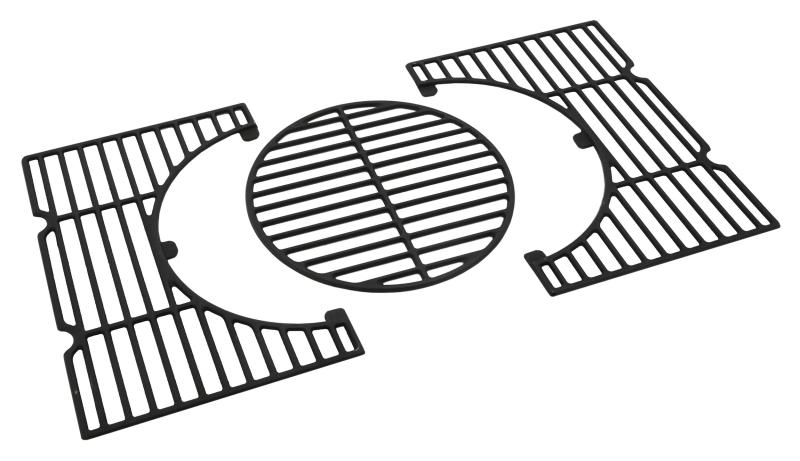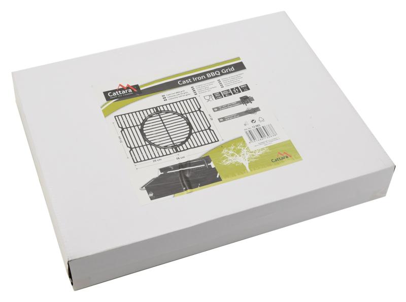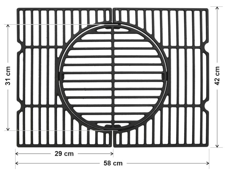 Litinový rošt s třídílnou konstrukcí s celkovými rozměry 58 x 42 cm se středovou částí o průměru 31 cm.Náhradní litinový rošt je vhodný přímo pro gril Cattara ROYAL 13040, ale i jiné grily odpovídajícíích rozměrů.