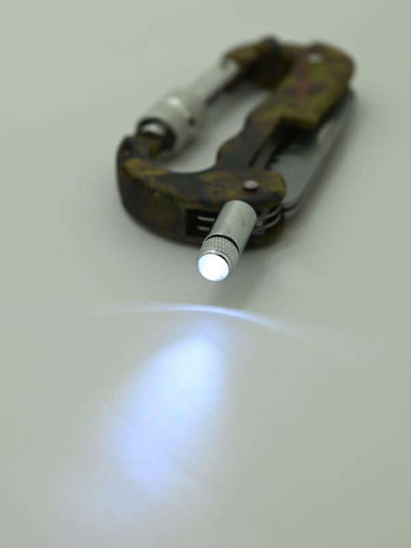 Multifunkčný nôž / karabína KAMU 3v1 s LED svietidlom a nástrojmi z nožiarskej ocele. Užitočný pomocník pre camping, rybolov a ďalšie outdoor využitie.