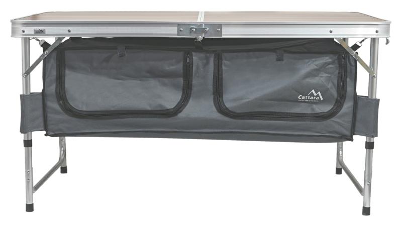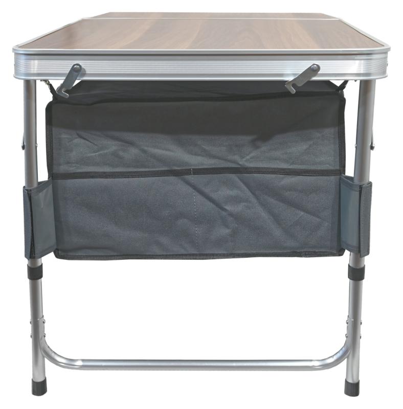 Praktický skládací stůl s nastavitelnou výškou a úložným prostorem, ideální pro kempování, zahradu i cestování. zobrazit celý popis