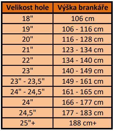 • Tabuľka veľkostí slúži iba na orientáciu. Pri brankárskych hokejkách je vždy najlepšie vyskúšať, záleží na postavení brankára.