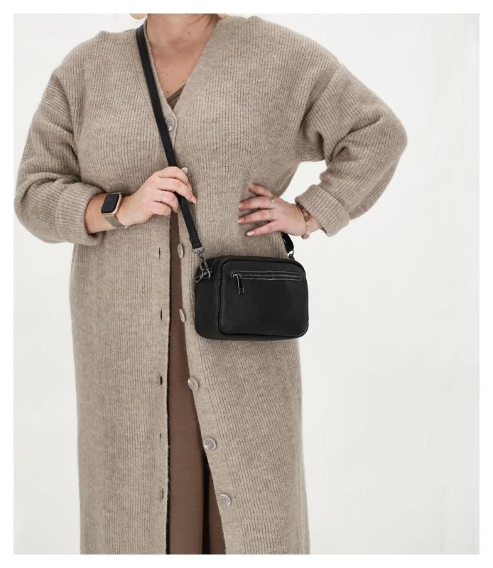 Tato černá kabelka je vyrobena z kvalitní kůže, která je mimořádně příjemná na dotek a používáním získává na jedinečné patině. Její čistý a klasický vzhled se snadno kombinuje s jakýmkoli outfitem, od ležérních džínů po elegantní šaty. Decentní kovové doplňky v tmavě šedém odstínu gun metal pak dodávají celkovému vzhledu punc moderního luxusu. Vnitřní uspořádání je navrženo pro maximální přehlednost. Hlavní kapsa na zip bezpečně uschová vaše cennosti, zatímco samostatná zadní kapsička je ideální na drobnosti, které chcete mít hned po ruce.