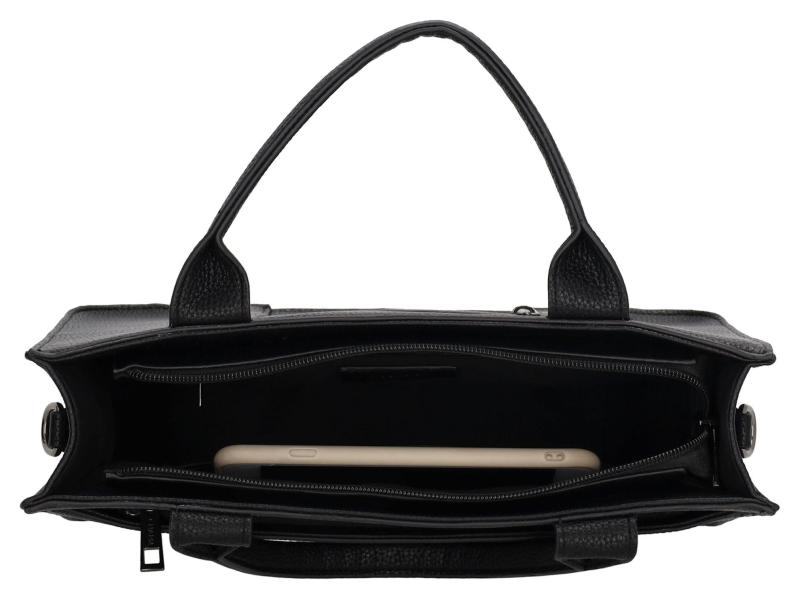 Tento nadčasový model spojuje styl a funkčnost, ať už jdete do práce, na schůzku nebo na kávu s přáteli. Její univerzální černá barva snadno doplní jakýkoli outfit, a díky kvalitní syntetické kůži je odolná a příjemná na dotek. Pevná ucha dodávají kabelce klasický vzhled, zatímco odnímatelný a nastavitelný ramenní popruh umožňuje pohodlné nošení v ruce i přes rameno. Kovové detaily v decentní barvě gun metal podtrhují elegantní charakter kabelky.