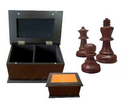 Toto prevedenie je kombináciou luxusných šachových figúr a dreveného boxu zdobeného intarziou vo vysokom lesku.