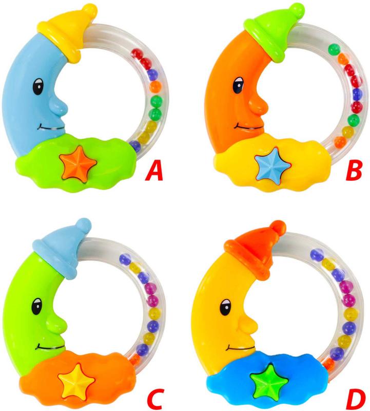 Barevný plastový měsíček, chrastítko s barevnými kuličkami, pro nejmenší děti, pro miminko. Velikost 11cm. 4 barevné kombinace.Hrklávka/štěrchátko je odjakživa oblíbená hračka těch nejmenších. Chrastící zvuk děti uklidňuje, navíc se děťátko učí vnímat a zpracovávat okolní podněty.