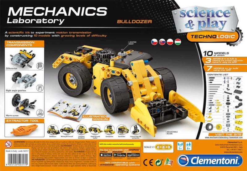 Sestavte si s CLEMENTONI Mechanickou laboratoří Buldozer a dalších 9 stavebních vozidel. Sada obsahuje 200 dílků jako jsou plochá a kuželová ozubená kola, stojany, diferenciály, šnekové šrouby, pneumatiky a mnoho dalších. Lžíce buldozeru se zvedne díky šnekové převodovce a vozidlo mění směr, když otáčíte volantem.