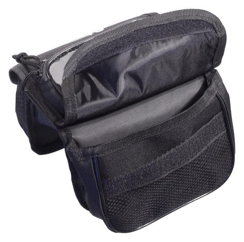 Cyklobrašňa na upevnenie na hornú časť rámu pred riadidlami. Jednoduché uchytenie pomocou pásikov so suchým zipsom s vysokou pevnosťou.Brašňa je vybavená dvoma bočnými vreckami o objeme 0,75 L, ktoré sú uzatvárateľné na suchý zips a odnímateľným vreckom na telefón až do veľkosti displeja 5".