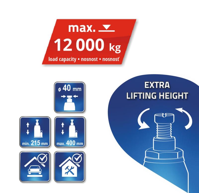 Hydraulický hever s maximální nosností 12t a volitelnou pracovní výškou zvedáku.Hever je tvořen masivní podstavnou deskou a kvalitně zpracovaným, celokovovým válcem. Samotný zdvih je prováděn užitím pístové pumpy, pomocí dvoudílné zvedací páky. Výšku zdvihu pak lze regulovat šroubováním nosné plochy a plynulé, zpětné spouštění je provedeno povolením ventilu.