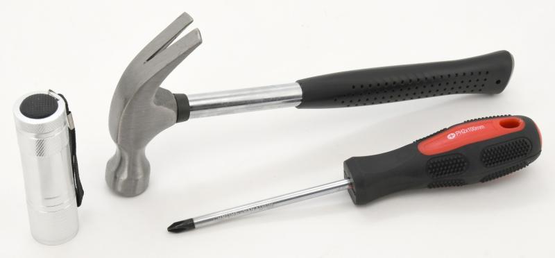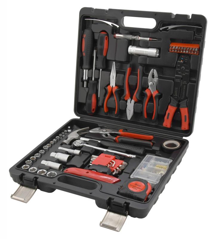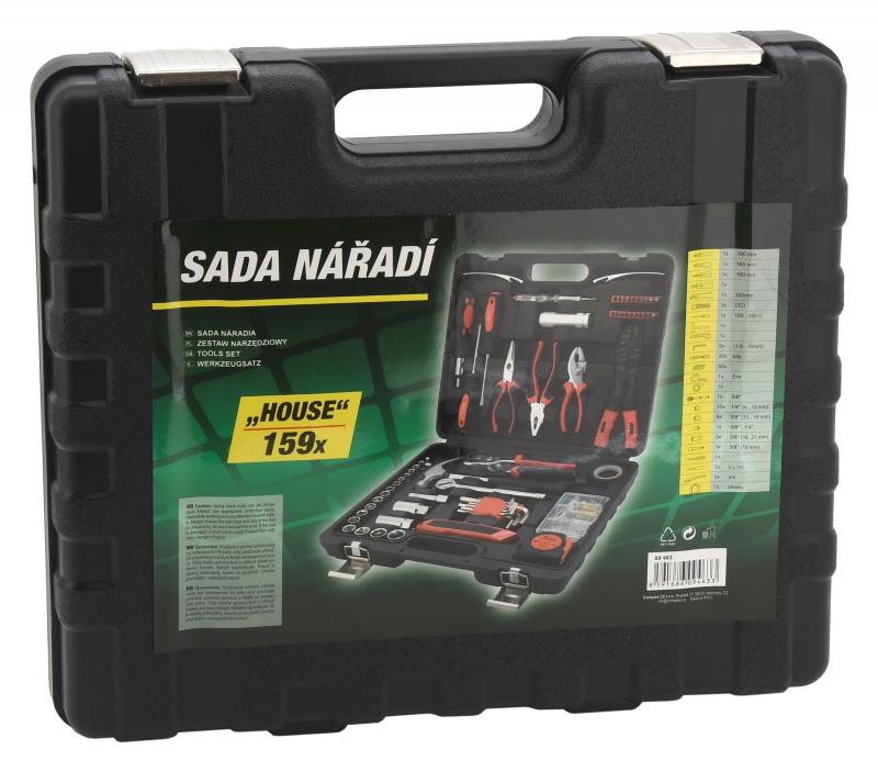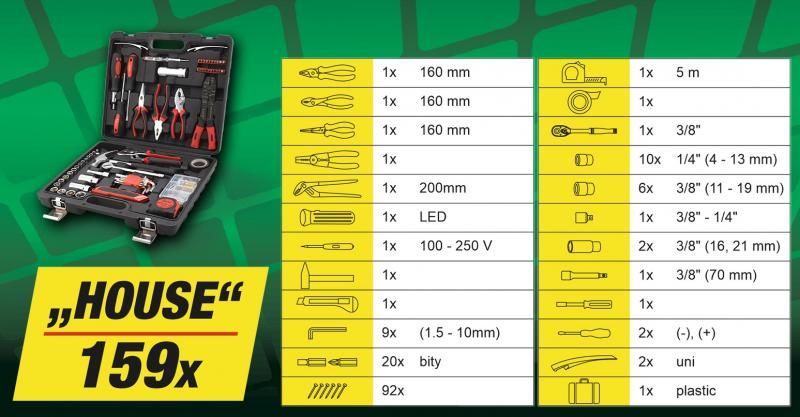 Sada obsahuje ergonomické šroubováky, imbusové klíče, žiletkový nůž, nejběžnější typy kleští včetně elektrikářských, kladivo, 3/8" ráčnu s nástavci, LED svítilnu, šroubovák na bity včetně 20ks bitů, svinovací metr (5 m), izolační pásku a další. Mimojiné je sada opatřena pouzdrem s 92 ks spojovacího materiálu.