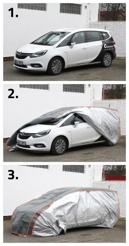 Jednoduché upevnění plachty - pouze se nasadí na automobil, na spodku se upevní část s všitou gumou za vhodné záhyby karoserie / nárazníku a přední i zadní část plachty se důkladně upevní pomocí všitých popruhů se sponami.
