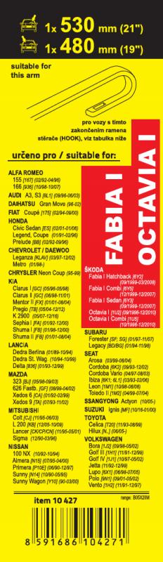 Sada dvou plochých stěračů FLAT (řidič + spolujezdec) se speciálním uchycením. Délky stěračů a systém uchycení na ramínko jsou přizpůsobeny vybraným vozům (viz tabulka použití).Vysoce kvalitní pružný člen plochého stěrače zajišťuje stejnoměrný tlak grafitového břitu v celé jeho délce, což zamezuje rozmazávání nečistot a vytváření pruhů.