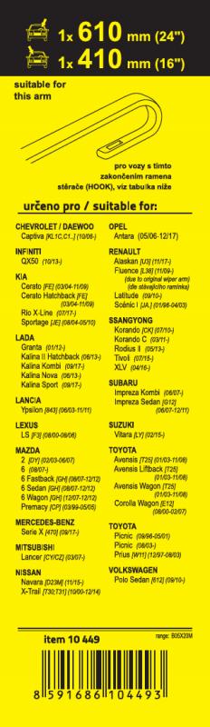 Sada dvou plochých stěračů FLAT (řidič + spolujezdec) se speciálním uchycením. Délky stěračů a systém uchycení na ramínko jsou přizpůsobeny vybraným vozům (viz tabulka použití).Vysoce kvalitní pružný člen plochého stěrače zajišťuje stejnoměrný tlak grafitového břitu v celé jeho délce, což zamezuje rozmazávání nečistot a vytváření pruhů.
