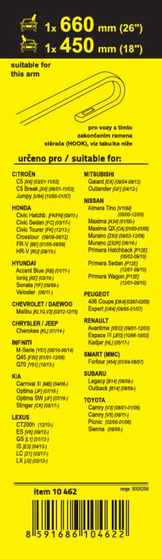 Sada dvou plochých stěračů FLAT (řidič + spolujezdec) se speciálním uchycením. Délky stěračů a systém uchycení na ramínko jsou přizpůsobeny vybraným vozům (viz tabulka použití).Vysoce kvalitní pružný člen plochého stěrače zajišťuje stejnoměrný tlak grafitového břitu v celé jeho délce, což zamezuje rozmazávání nečistot a vytváření pruhů.