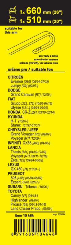 Sada dvou plochých stěračů FLAT (řidič + spolujezdec) se speciálním uchycením. Délky stěračů a systém uchycení na ramínko jsou přizpůsobeny vybraným vozům (viz tabulka použití).Vysoce kvalitní pružný člen plochého stěrače zajišťuje stejnoměrný tlak grafitového břitu v celé jeho délce, což zamezuje rozmazávání nečistot a vytváření pruhů.