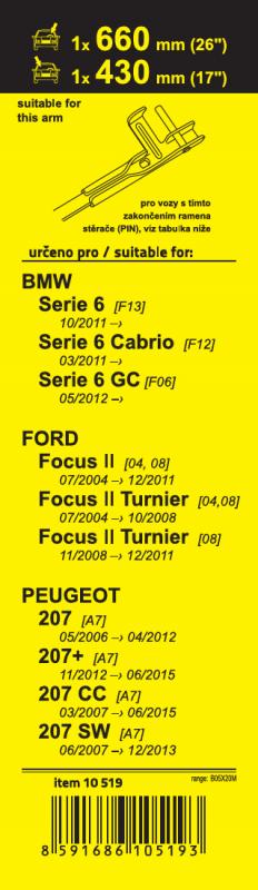 Sada dvou plochých stěračů FLAT (řidič + spolujezdec) se speciálním uchycením. Délky stěračů a systém uchycení na ramínko jsou přizpůsobeny vybraným vozům (viz tabulka použití).