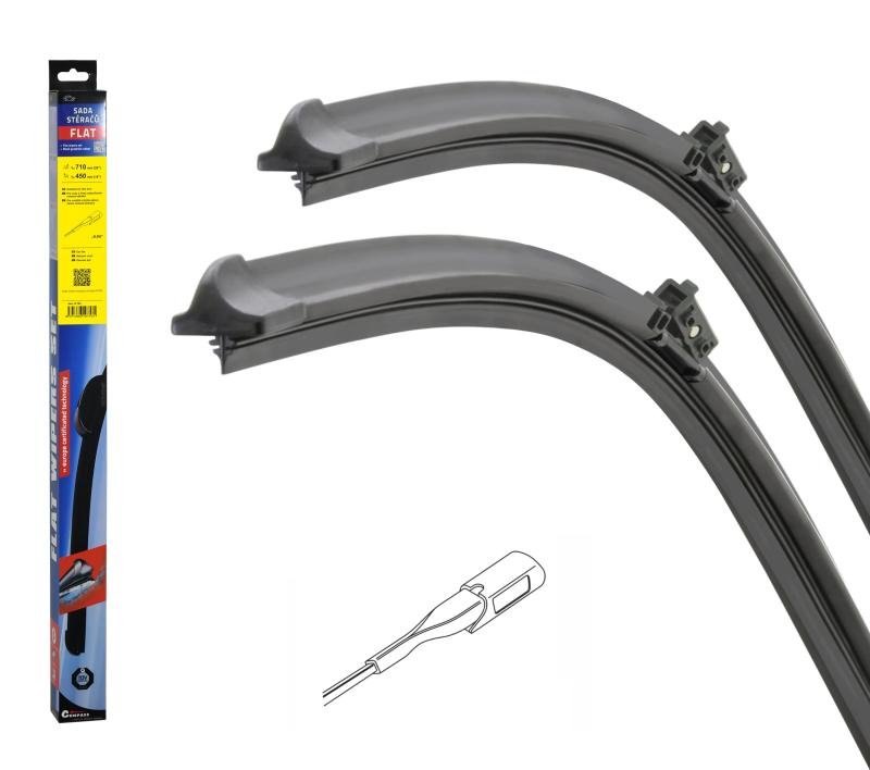 Sada dvou plochých stěračů FLAT (řidič + spolujezdec) se speciálním uchycením. Délky stěračů a systém uchycení na ramínko jsou přizpůsobeny vybraným vozům (viz tabulka použití).Vysoce kvalitní pružný člen plochého stěrače zajišťuje stejnoměrný tlak grafitového břitu v celé jeho délce, což zamezuje rozmazávání nečistot a vytváření pruhů.