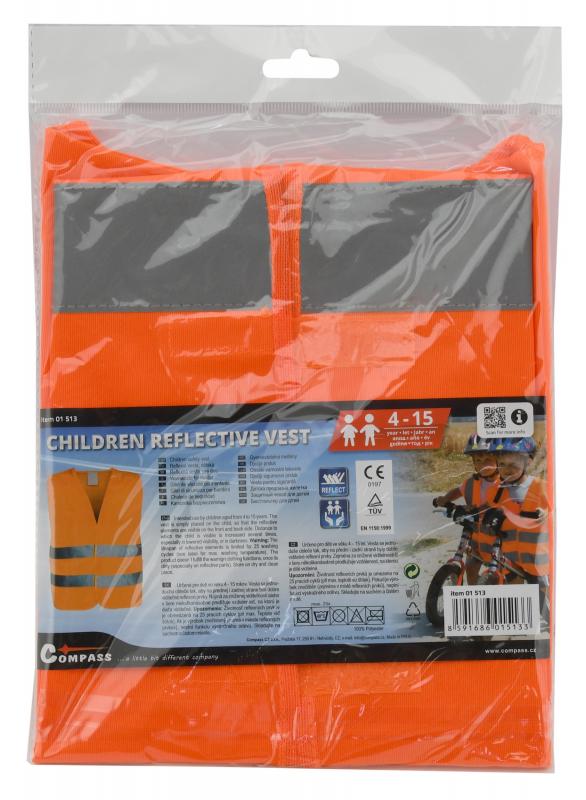 Výstražná reflexní vesta pro děti se zapínáním na suchý zip. Dva reflexní pruhy po celém obvodu, oranžová barva. Určeno pro děti ve věku 4 - 15 let.Vesta se obleče na stávající oděv tak, aby žádná její část nebyla překryta jinými částmi oděvu, a na přední straně se zapne pomocí suchého zipu.