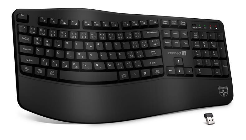 • CONNECT IT FOR HEALTH Ergonomická klávesnice, bezdrátová, USB 2.4GHz, CZ + SK verze, ČERNÁ• FOR HEALTH ErgoOffice BLACK