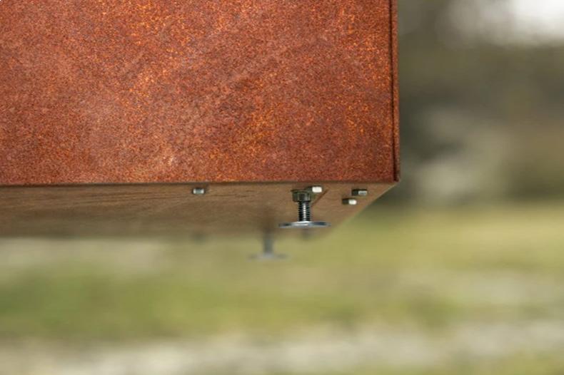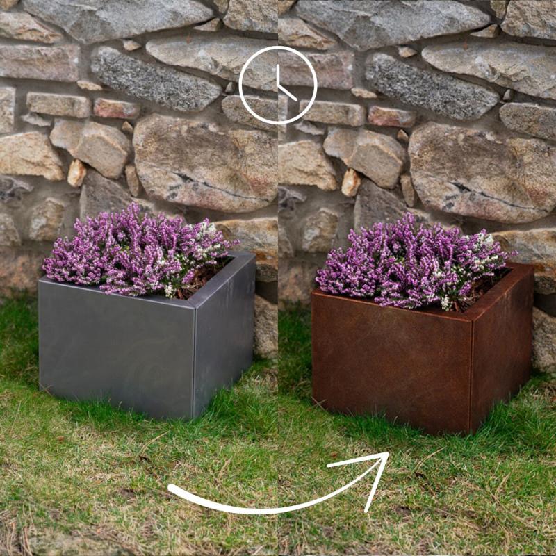 Odolný zahradní květináč z COR-TEN® oceli s přirozenou patinou, perforovaným dnem a nerezovými nožičkami pro snadnou montáž i použití venku.Tento zahradní květináč představuje kombinaci odolnosti a moderního designu, vhodný pro pěstování květin, bylin i menších keřů. Vyroben je z originální švédské legované oceli COR-TEN®, která při venkovním použití přirozeně získává odolnou patinu a nevyžaduje žádné další nátěry či údržbu. Minimalistické linie, horní dvojitý ohyb a nenápadné spojovací prvky z nerezu podtrhují jeho čistý a elegantní vzhled.